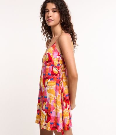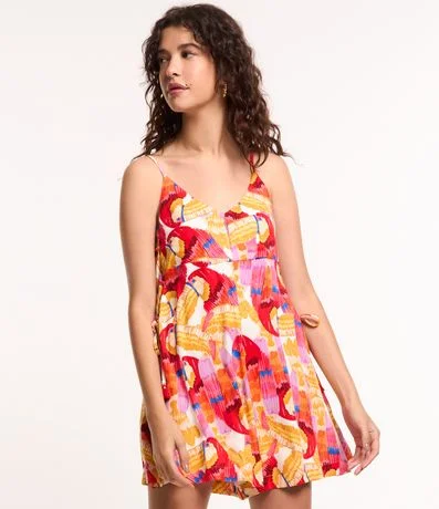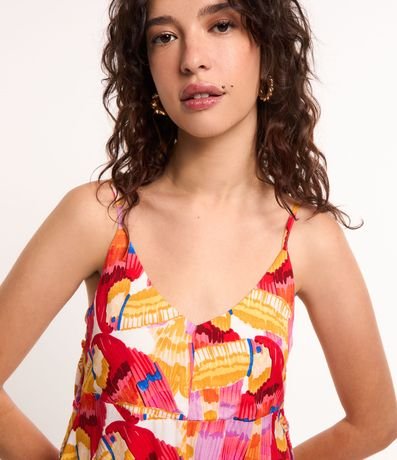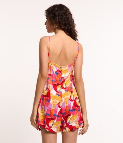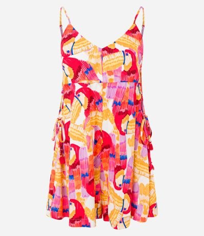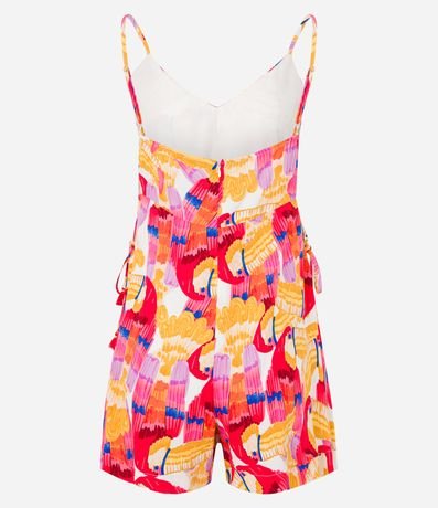 Macacão curto com alcinhas finas, fechamento por zíper nas costas, amarração com puxadinho na lateral e estampa tropical.