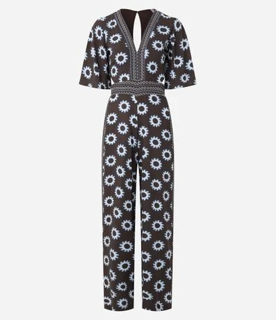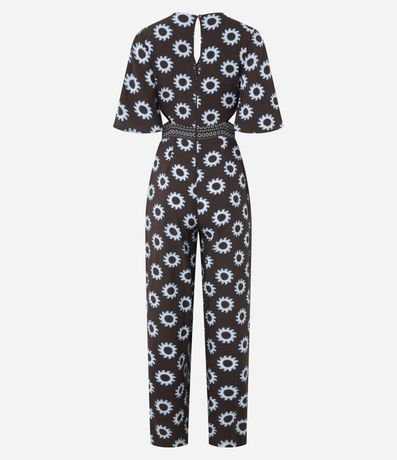 Ref: Macacão feminino confeccionado em viscose mais sustentável. Possui estampa repetida gráfica, decote v profundo na parte frontal, abertura central nas costas e lateral, acabamento do decote com faixa estampada contrastante, mangas curtas amplas com comprimento aproximado até o cotovelo e detalhe por faixa estampada contrastante na cintura e lateral das pernas.