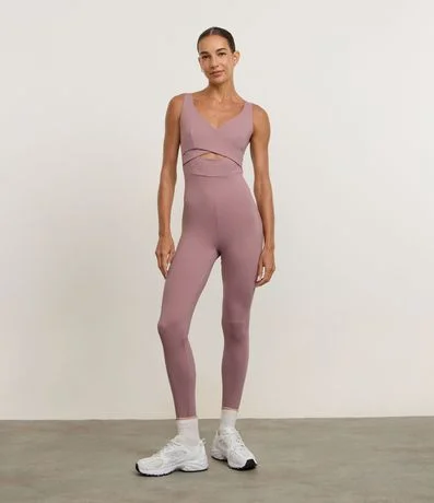 Ref: Macacão feminino esportivo confeccionado em microfibra atrvés de boas práticas ambientais. Possui toque suave e elasticidade para liberdade de movimentos. Possui modelo justo, sem mangas, decote em v e frente transpassada com recorte vazado.