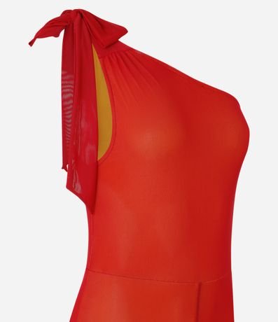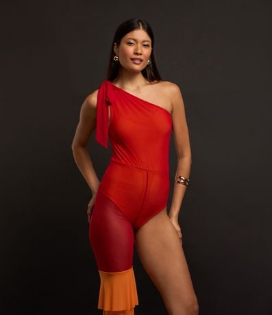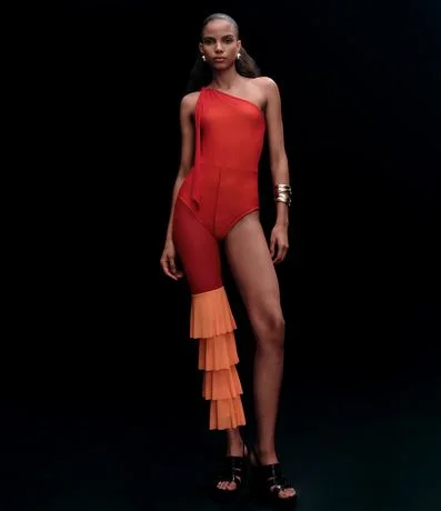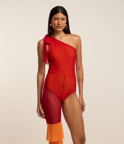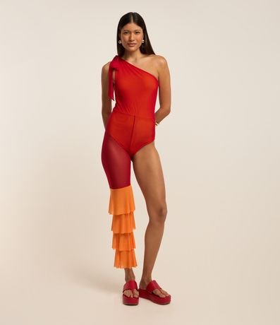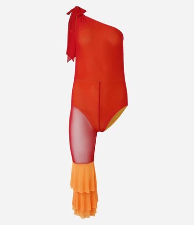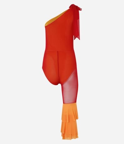 Macacão flare com um ombros só, laço no ombro, confeccionado em tule, uma perna só com babados contrastantes e transparência.