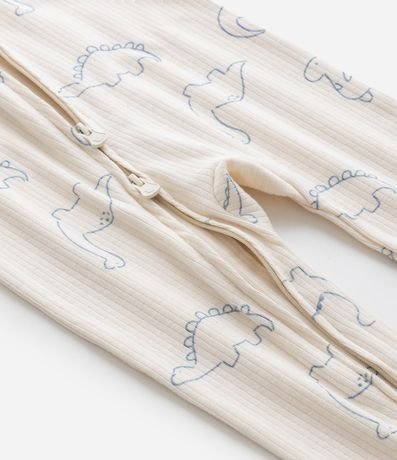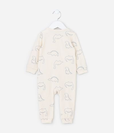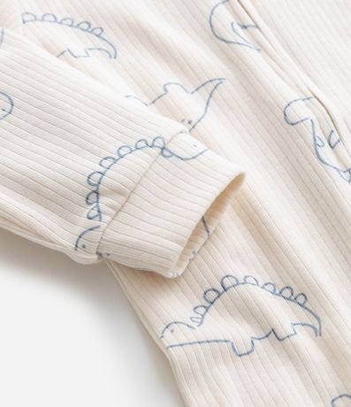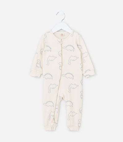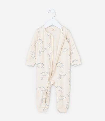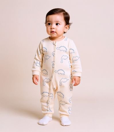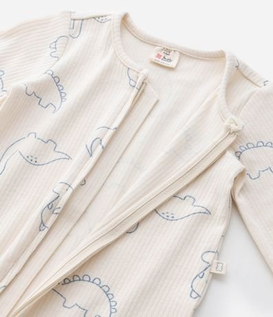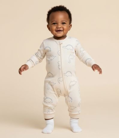 Ref: Macacão infantil confeccionado em algodão mais sustentável, de textura canelada, com gola redonda, mangas longas e estampa de dinossauros. Possui fechamento por zíper.
