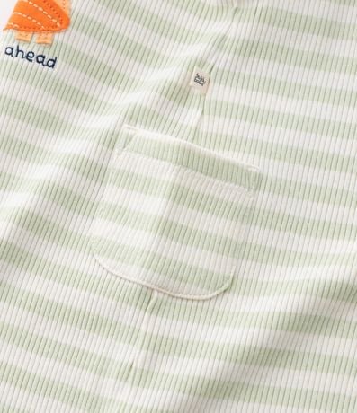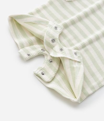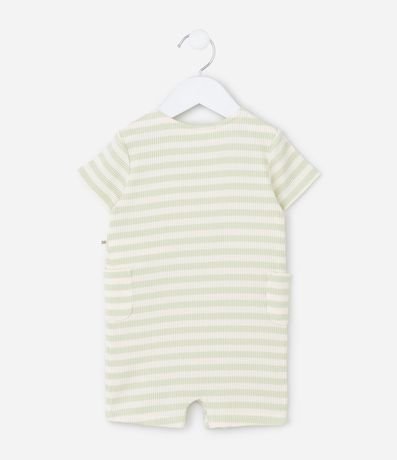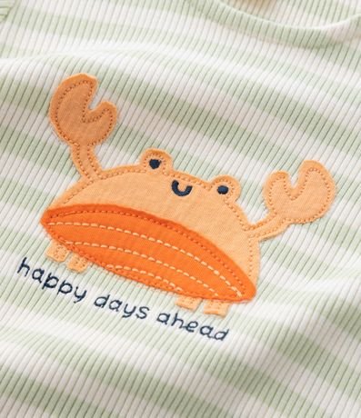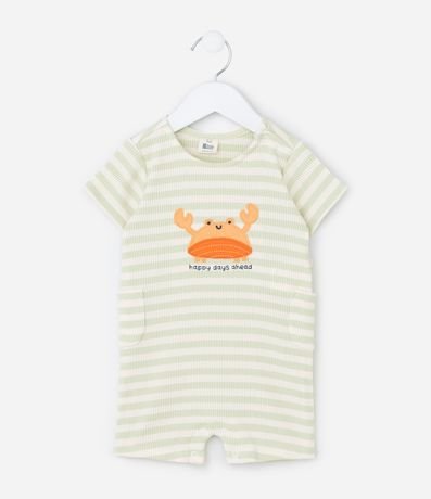Ref: Macacão infantil confeccionado em algodão mais sustentável, no modelo curto. Possui gola redonda, com abotoamento, manga curta, fechamento no entrepernas, estampa de listras, bordado de caranguejo e canelado.