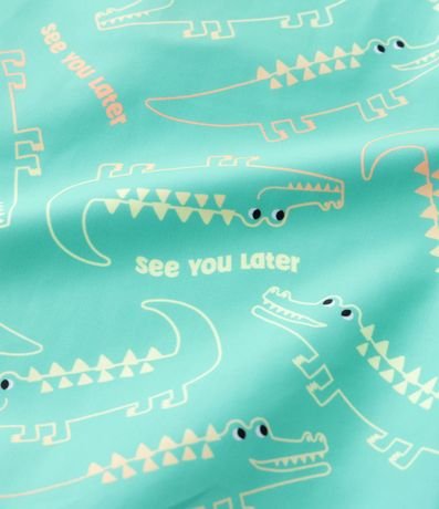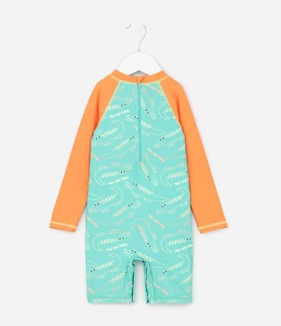 Macacão infantil de praia, confeccionado em microfibra, com gola redonda e mangas longas. Possui estampa de jacarés, cristas em 3D, proteção UV e zíper.