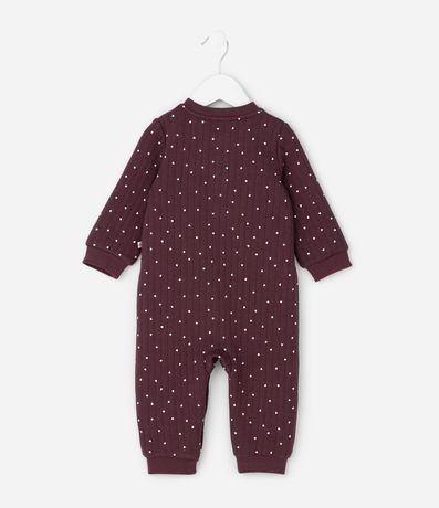 Ref: Macacção infantil confeccionado em matelassê macio com poliéster certificado GRS, oferecendo toque aconchegante e leve aquecimento. Possui gola redonda, mangas longas, abotoamento frontal por botões de pressão e estampa fullprint de poá, com punhos ajustados para melhor caimento.