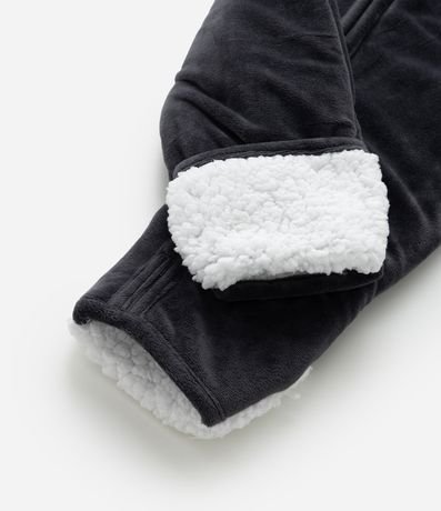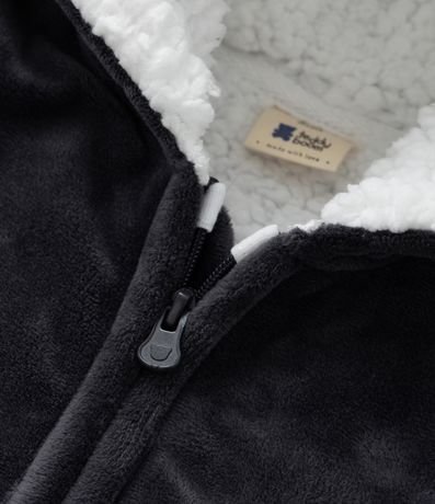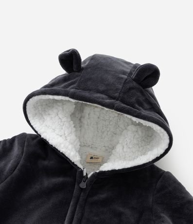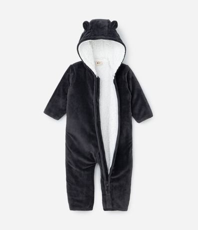 Ref: Macacão infantil, longo, com zíper frontal, em plush, quentinho, forro peludinho em sherpa e capuz com orelhinhas aplicadas.