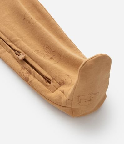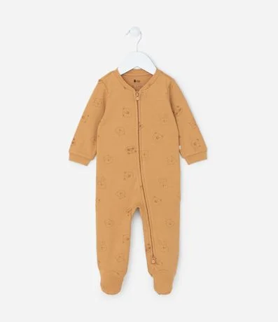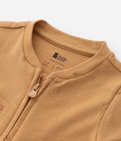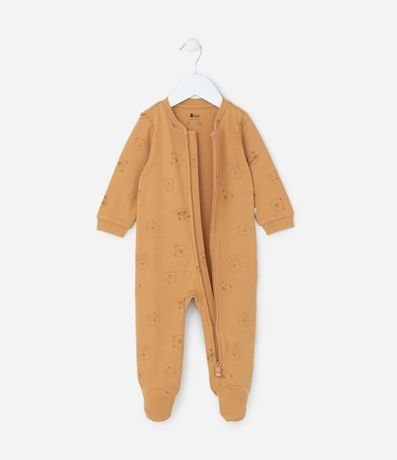 Ref: Macacão infantil confeccionado em suedine de algodão mais sustentável. Possui gola redonda, mangas longas, fechamento por zíper e estampa de carinhas de bichinhos.