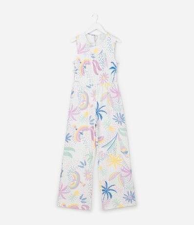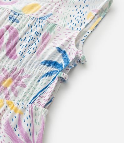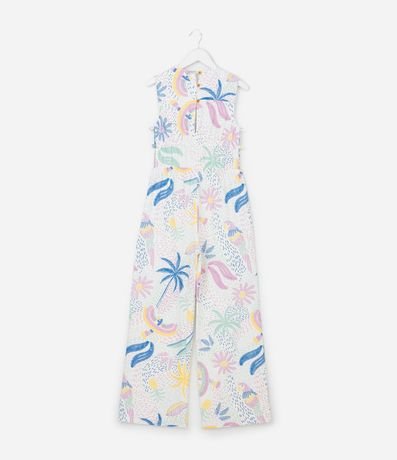Ref: Macacão infantil confeccionado em viscolinho mais sustentável. Possui gola redonda, sem mangas, abotoamento traseiro, abertura lateral e estampa tropical.