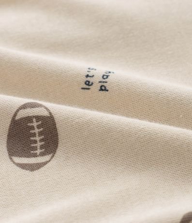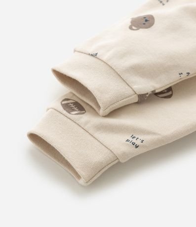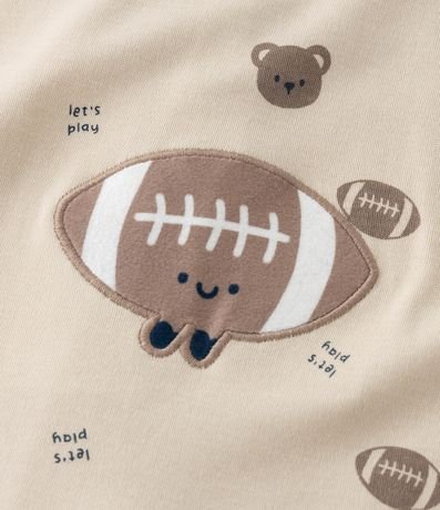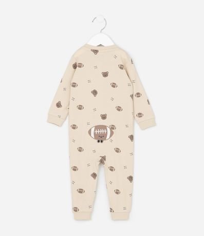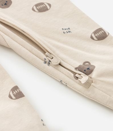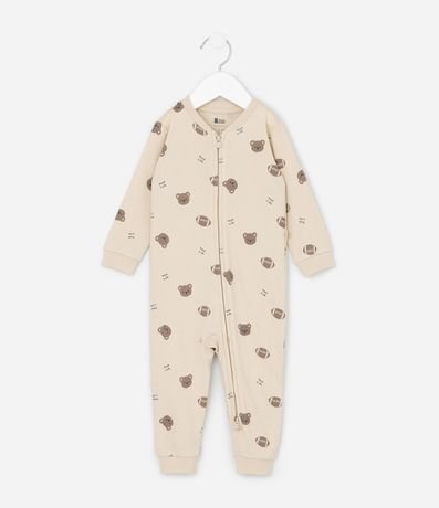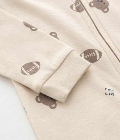 Macacão infantil confeccionado em algodão certificado BCI e boas práticas ambientais, em suedine leve com estampa de ursinhos e bolas esportivas. Possui gola redonda, mangas longas, zíper frontal duplo e bordado aplicado no bumbum. Estrutura macia ideal para o conforto do bebê.