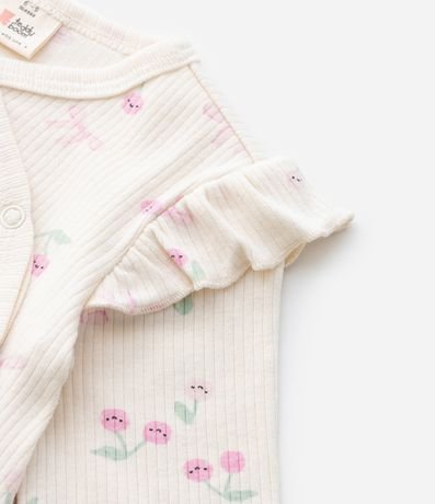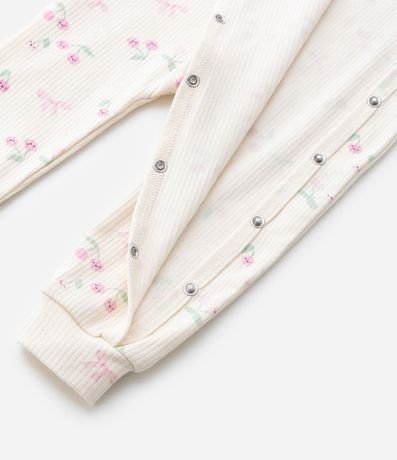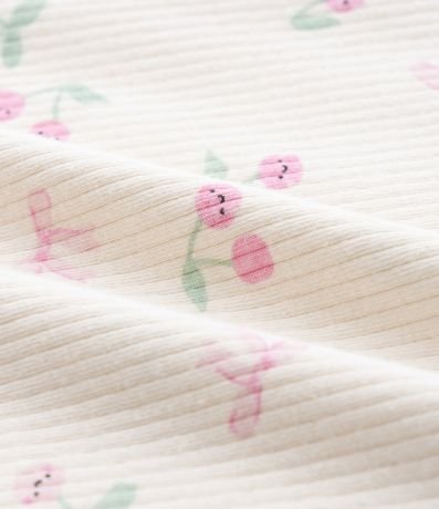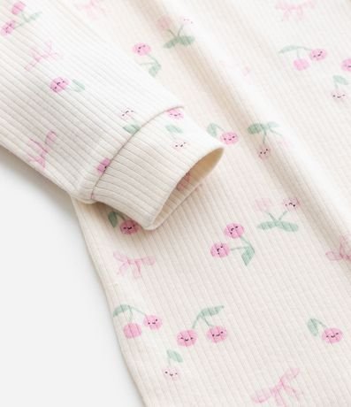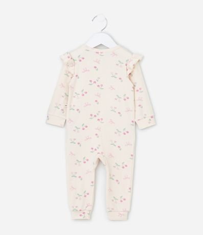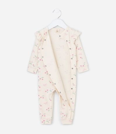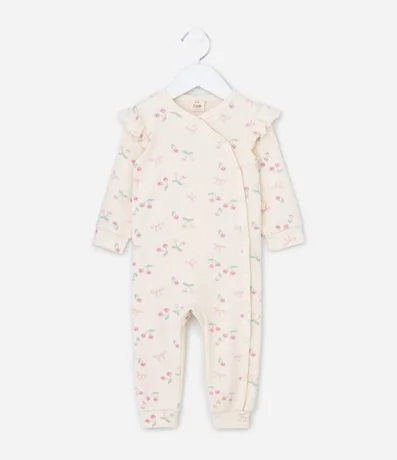 Ref: Macacão infantil manga longa em canelado leve, confeccionado em algodão certificado BCI. Possui gola redonda, estampa fullprint de cerejinhas, babadinhos nos ombros e abertura lateral com botões de pressão, facilitando o vestir e garantindo conforto para o dia a dia do bebê.