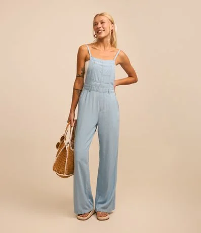 Ref: Macacão feminino no modelo jardineira, confeccionada em jeans mais sustentável, decote reto, alças finas, bolso, com amarração nas costas e passantes na cintura.