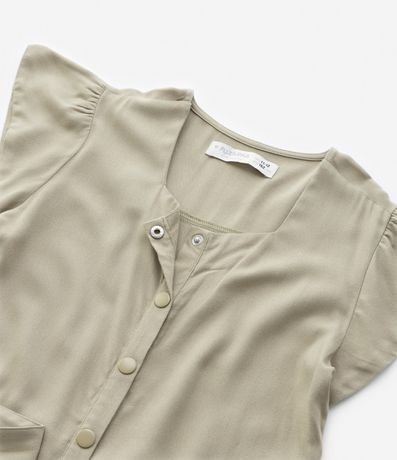 Macacão infantil de modelo jogger, confeccionado em viscose twill, com elástico no bunho e sem estampa. Possui gola quadrada, mangas curtas, abotoamento frontal e bolsos.