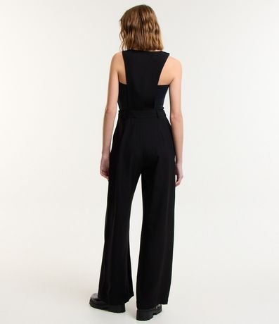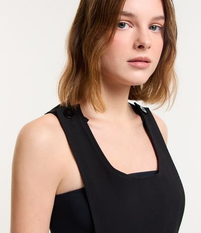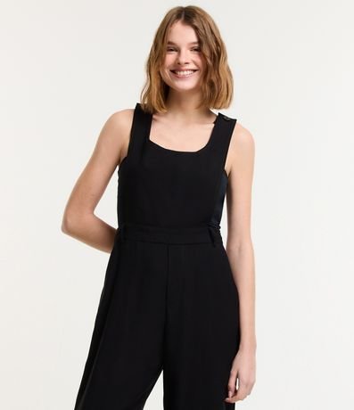 Ref: Macacão longo feminino, confeccionado em viscose, sem mangas, com decote quadrado, cava alongada lateral e superfície sem estampa.