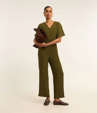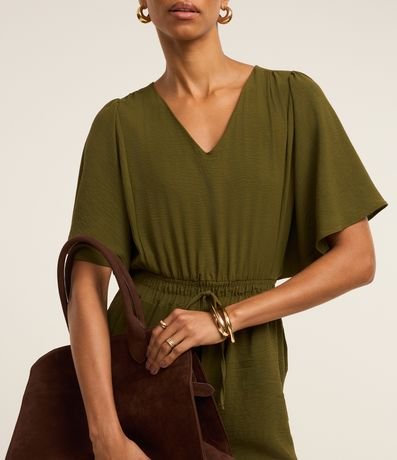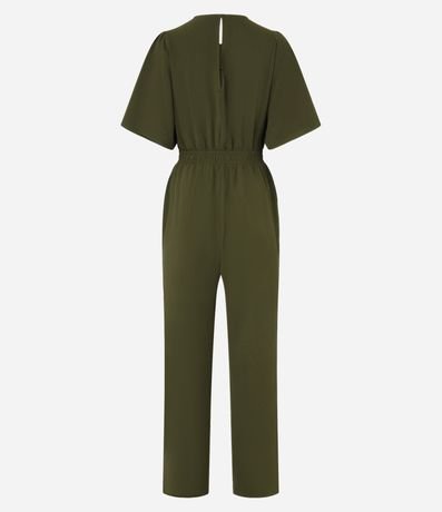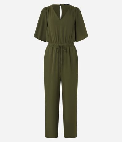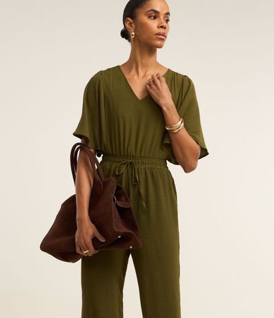 Ref: Macacão feminino confeccionado em airflow, tecido de efeito amassado. Possui gola V, mangas curtas, abertura nas costas e detalhe de amarração na cintura.