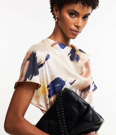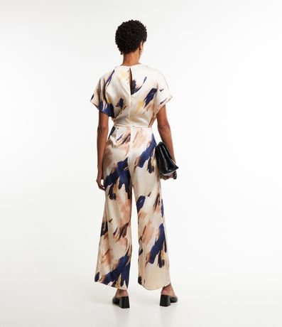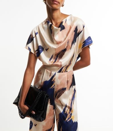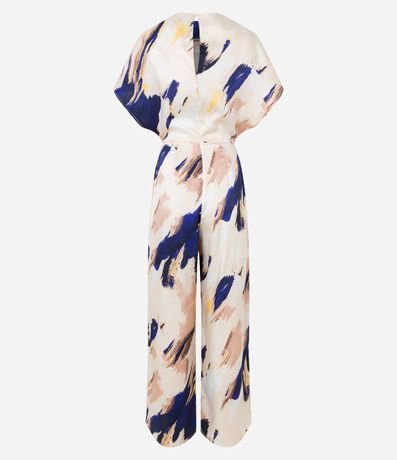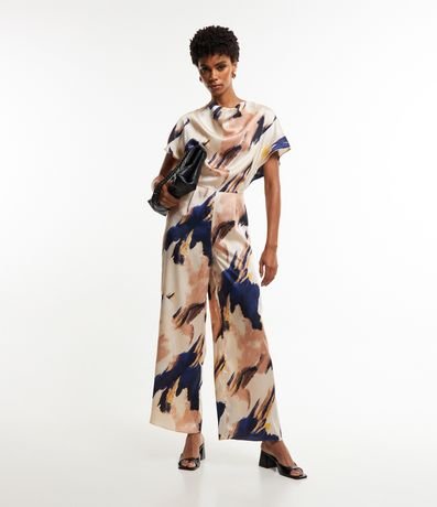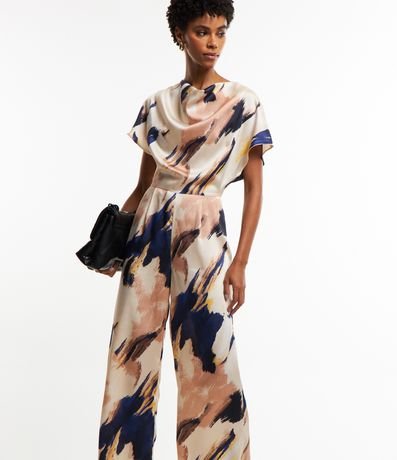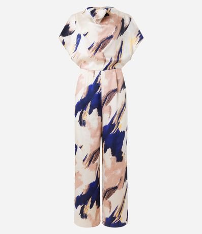 Ref: Macacão longo em crepe, com gola degagê, mangas curtas, pregas e estampa abstrata modernista.