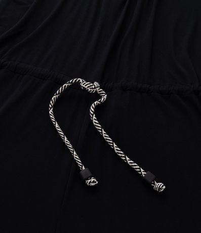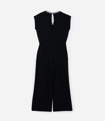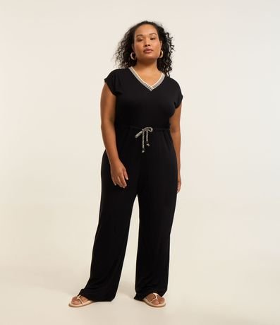 Ref: Macacão longo confeccionado em crepe de viscose mais sustentável, sem estampa. A peça não tem mangas e possui decote V em tricô, fechamento gota nas costas e amarração na cintura.