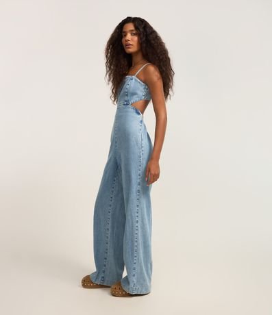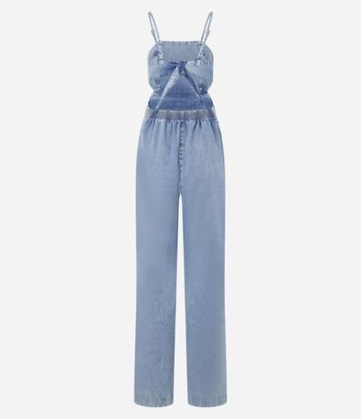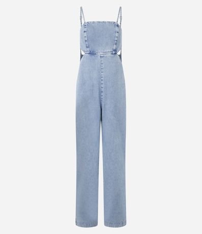 Ref: Macacão longo com alcinhas reguláveis, confeccionada em jeans com algodão bci, recorte vazado com amarração nas costas e elástico traseiro na cintura.