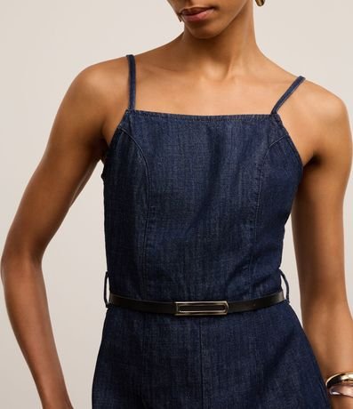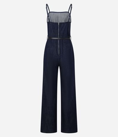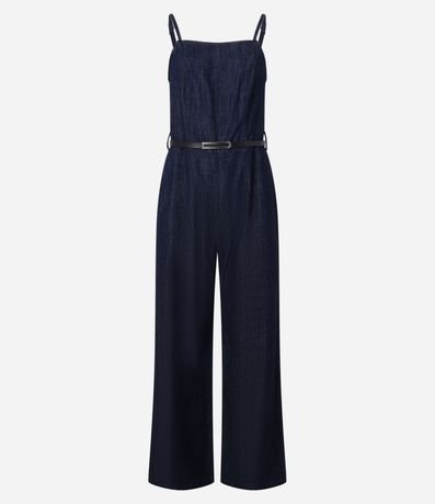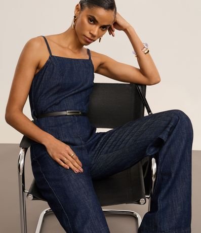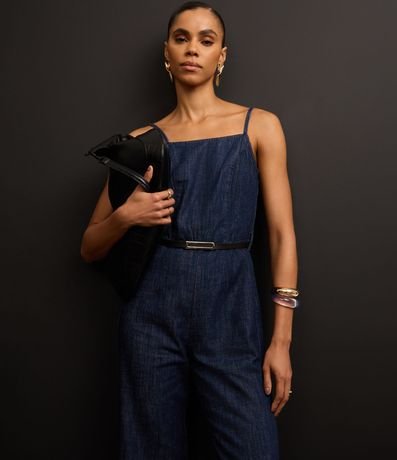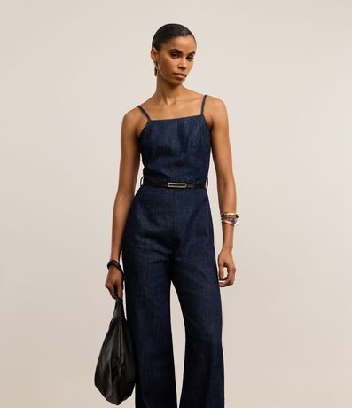 Ref: Macacão longo com alcinha fina e regulável, confeccionado em jeans com algodão bci, possui recortes na frente e cintinho com fivela na cintura.