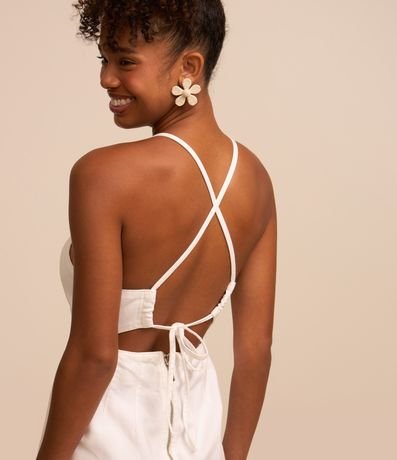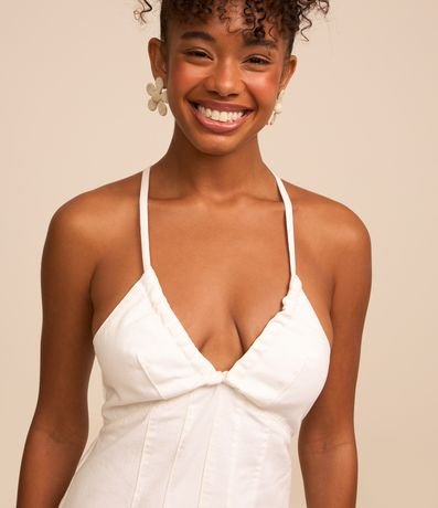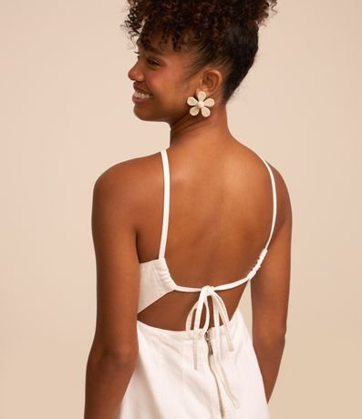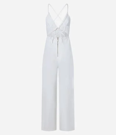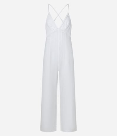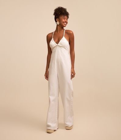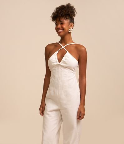 Ref: Macacão feminino longo confeccionado em sarja mais sustentável com decote em v, alças finas e amarração nas costas e zíper.