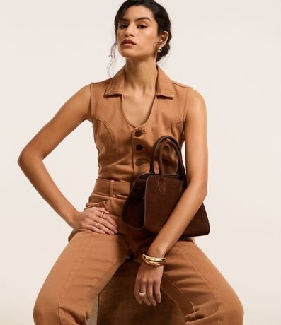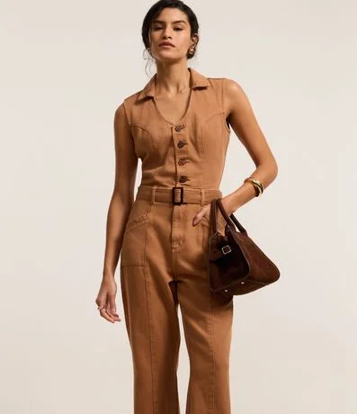 Ref: Macacão longo sem manga, confeccionado em sarja. Abotoamento frontal e cinto com fivela na cintura.