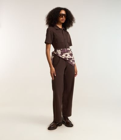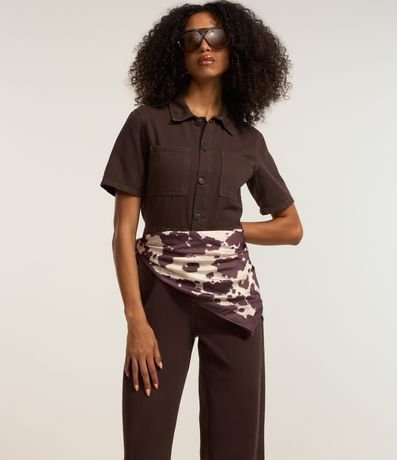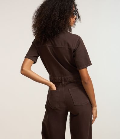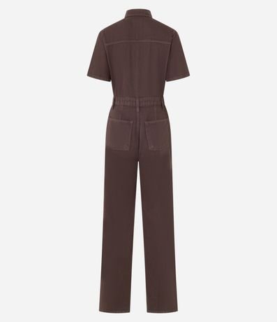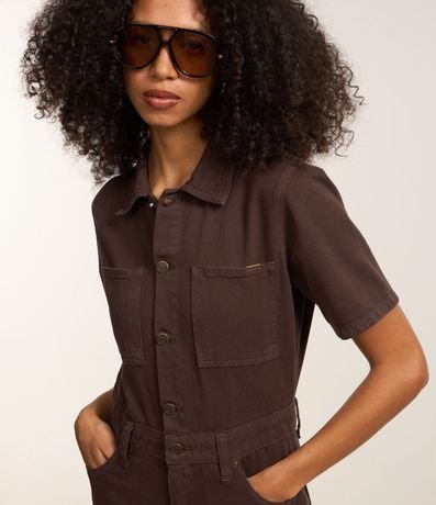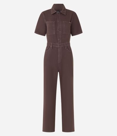 Ref: Macacão longo com manga curta, confeccionado em sarja com algodão bci mais sustentável, dois bolsos no peito e abotoamento frotal.