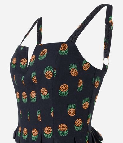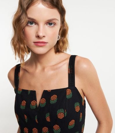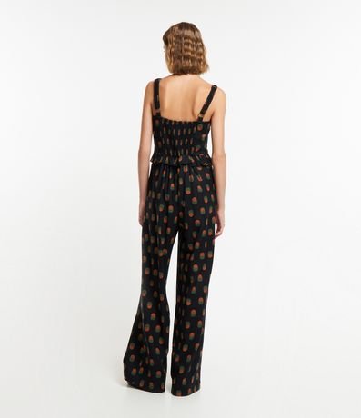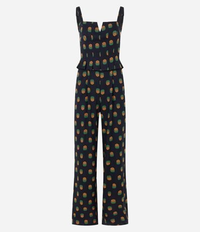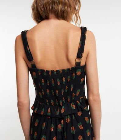 Macacão feminino confeccionado em viscolinho, de modelo longo, com decote quadrado e alças médias. Possui estampa de abacaxis, babadinho na cintura e lastex nas costas.