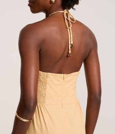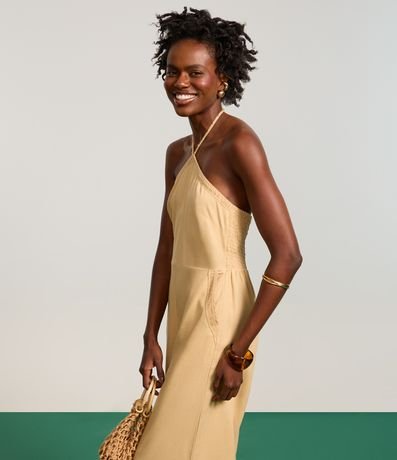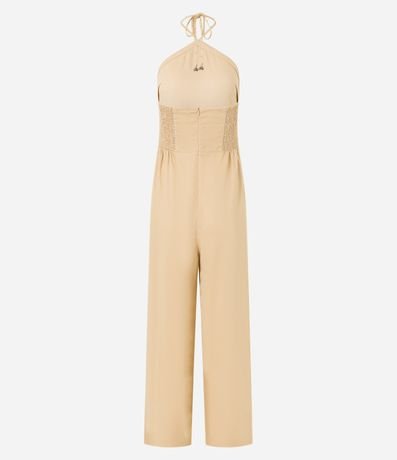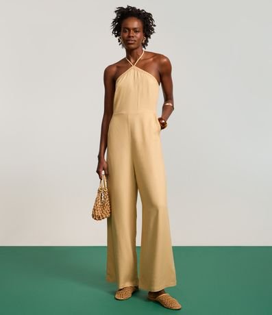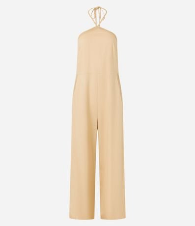 Ref: Macacão pantalona com decote halter, amarração no pescoço, lastex nas laterais e fechamento por zíper nas costas.