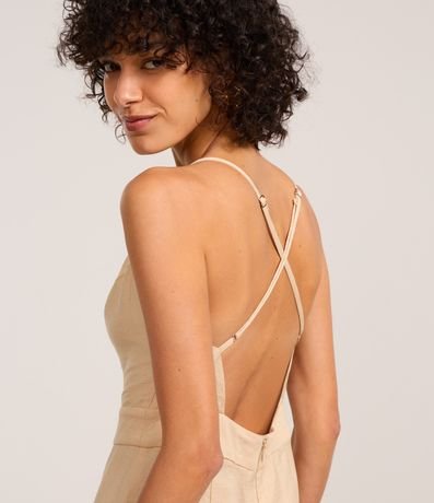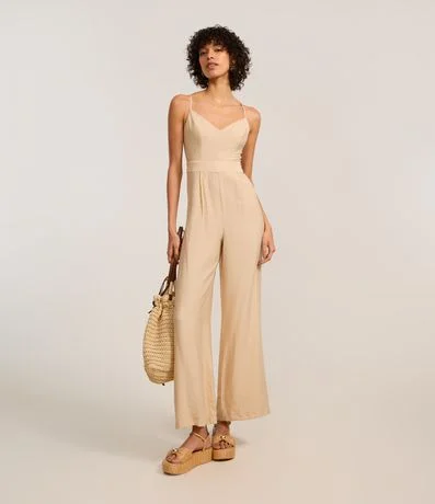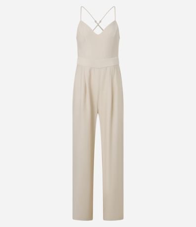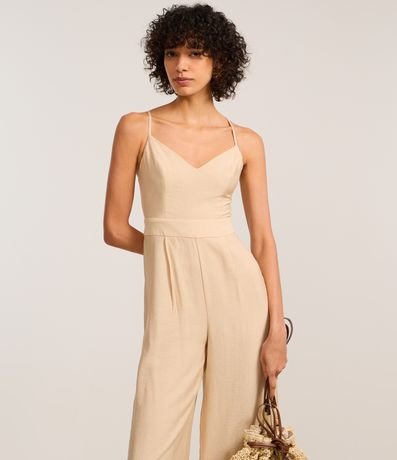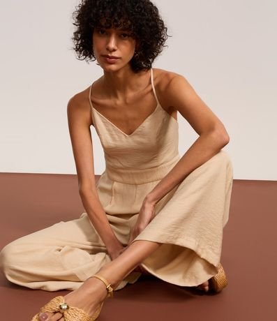 Ref: Macacão longo com alças finas cruzadas nas costas, confeccionada em viscose certificada e produzido em boas práticas ambientais. Possui fechamento por zíper na parte de trás e recortes.
