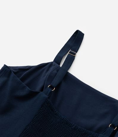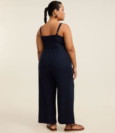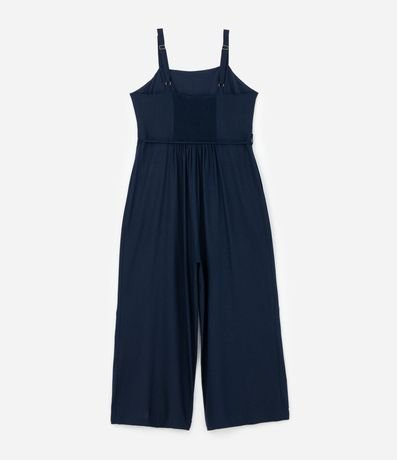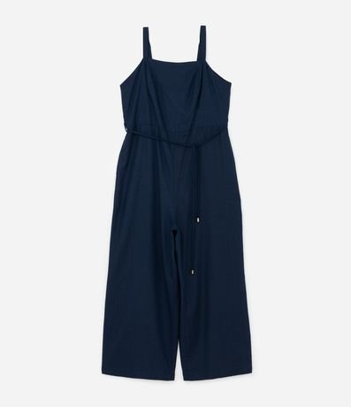 Macacão feminino Curve & Plus Size confeccionado em viscose certificada com boas práticas ambientais, peça no modelo pantacourt, alças médias ajustáveis e cinto de amarração.