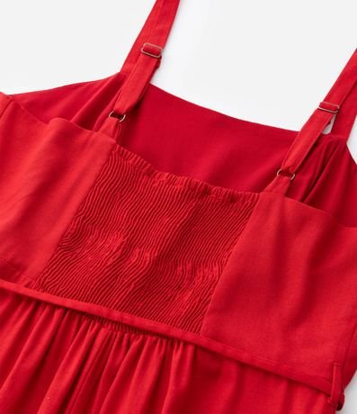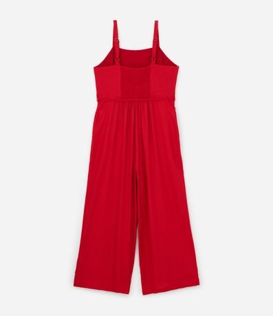Macacão feminino Curve & Plus Size confeccionado em viscose certificada com boas práticas ambientais, peça no modelo pantacourt, alças médias ajustáveis e cinto de amarração.