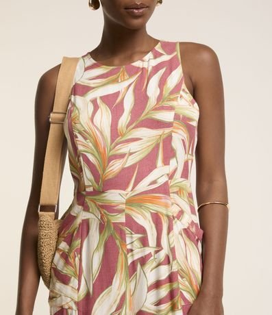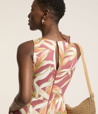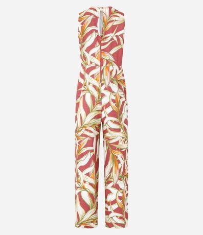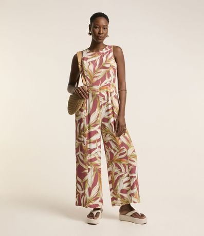 Ref: Macacão feminino em viscose mais sustentável, modelo pantacourt com decote reto, fechamento traseiro por zíper com estampa de folhagem.