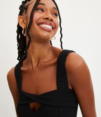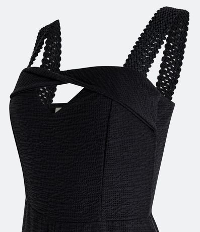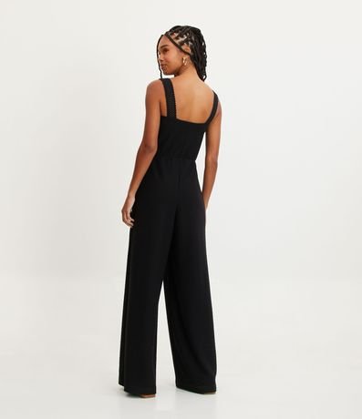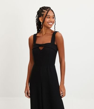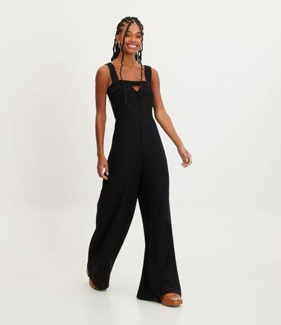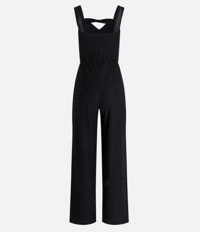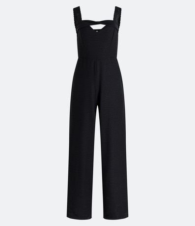 Ref: Macacão pantalona, texturizado, alças largas diferenciadas, detalhe torcido no decote e recorte vazado no busto.