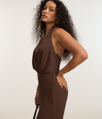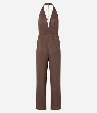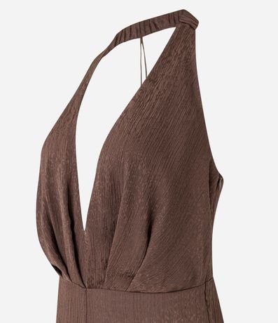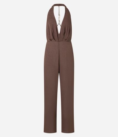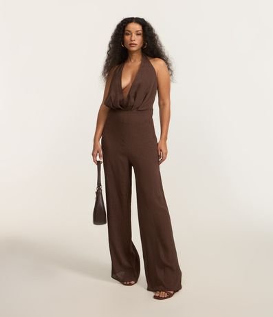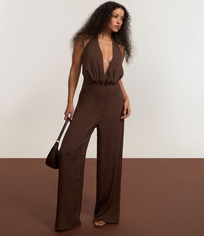 Macacão pantalona, texturizado, frente única com aviamento no centro das costas, decote v e confeccionado em cetim.