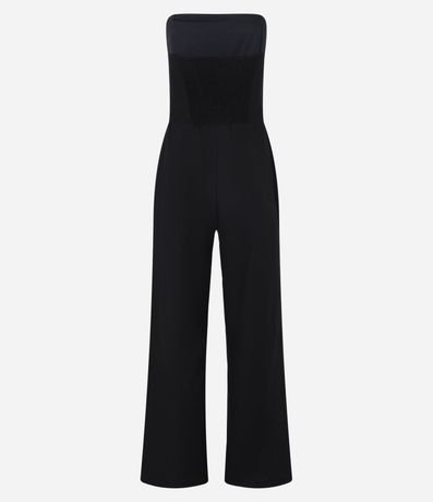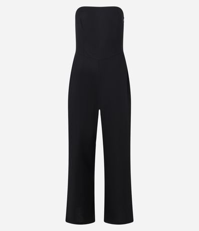 Ref: Macacão reto com decote tomara que caia, fechamento por zíper na lateral e lastex nas costas.