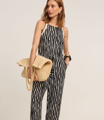 Macacão feminino de modelo longo, confeccionado em viscose certificada, com decote quadrado e alças regata. Possui amarração na cintura, bolsos, estampa geométrica desconstruída e detalhes de tricô na cava.