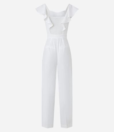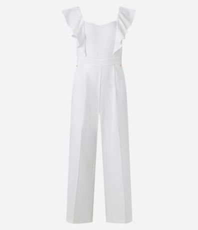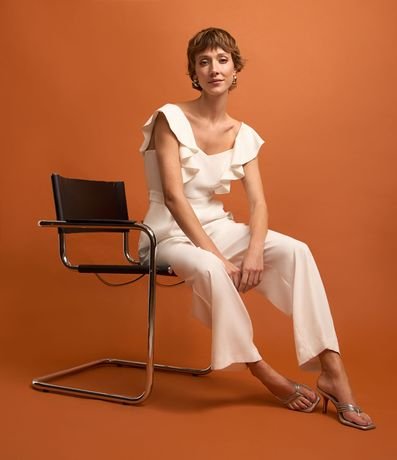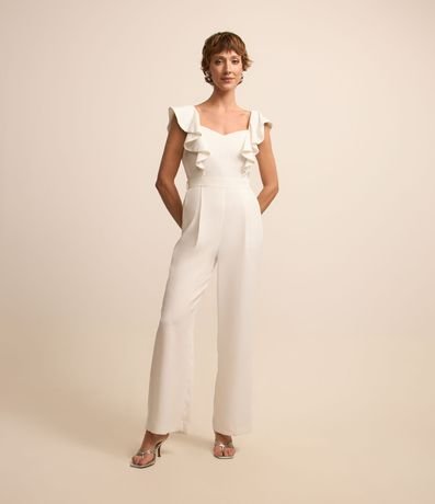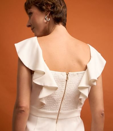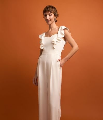 Ref: Macacão sem mangas confeccionado em crepe com decote reto, babados nas cavas, lastex nas costas, pregas frontais e recortes traseiros que simulam bolsos.