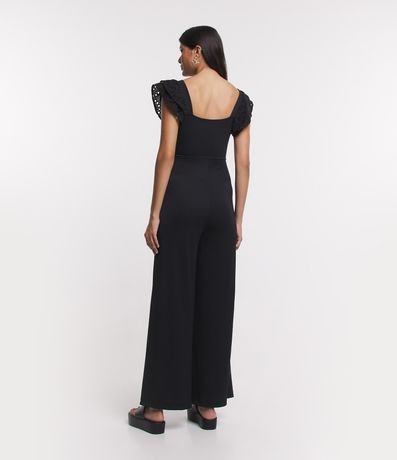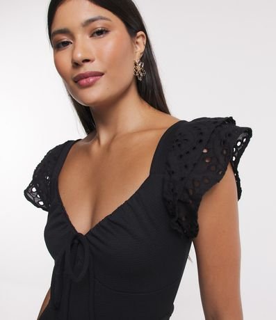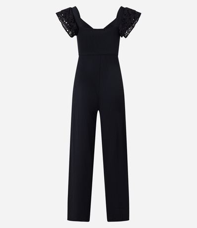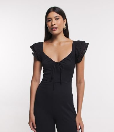 Ref: Macacão sem mangas em tecido texturizado com decote V, amarração no decote e babados de laise com furos nos ombros.