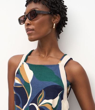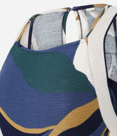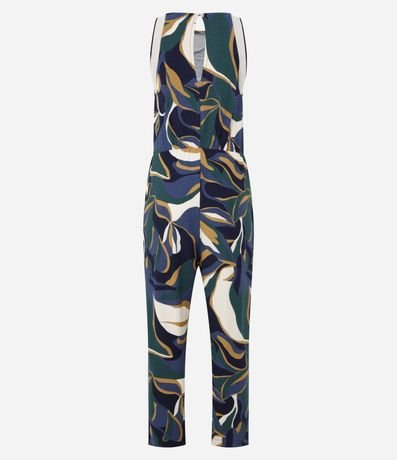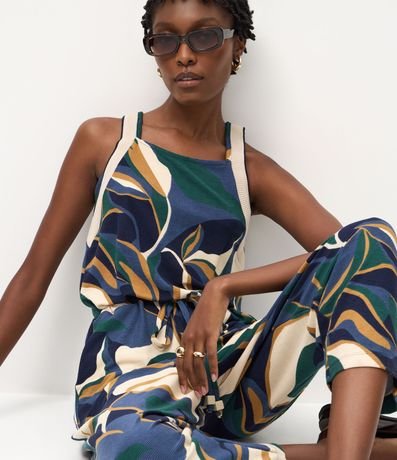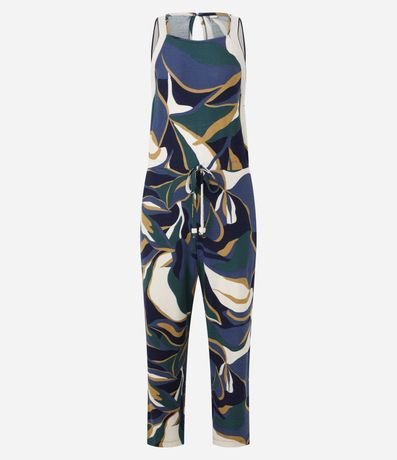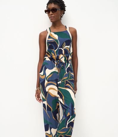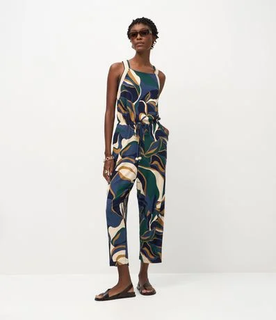 Macacão feminino confeccionado em viscose certificada, através de boas práticas ambientais. Apresenta estampa abstrata em toda a peça e modelagem sem mangas no estilo regata. A parte superior possui gola reta, alças médias e abertura na parte de trás. A cintura conta com cordão para amarração ajustável.