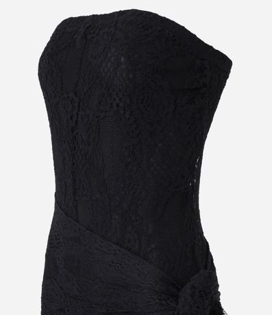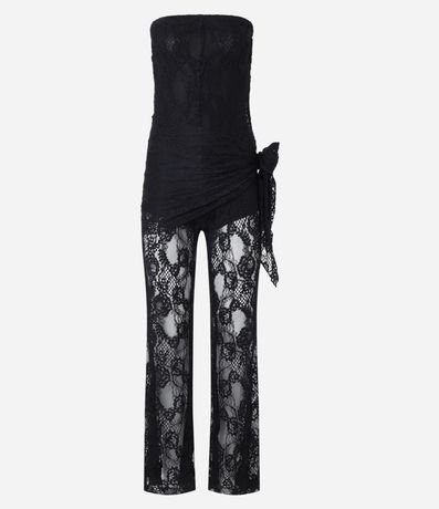 Ref: Macacão sem alças confeccionada em renda com amarração na lateral e transparência parcial nas pernas.