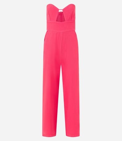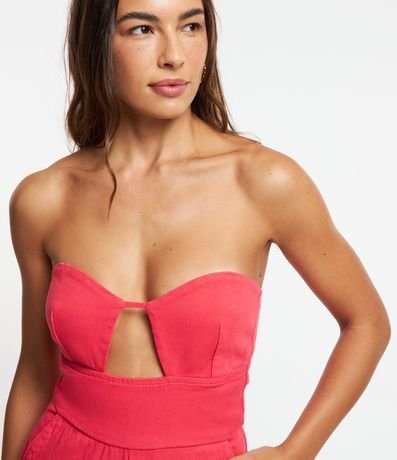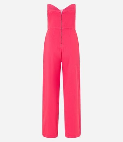 Macacão sem alças em sarja com decote coração tomara que caia, fechamento traseiro por zíper e vazado logo abaixo do busto.
