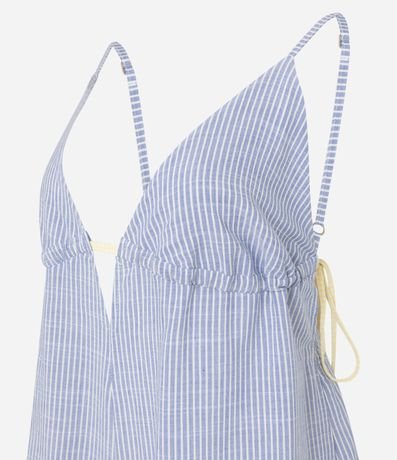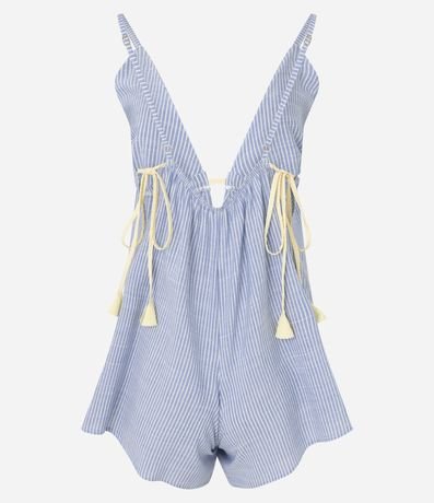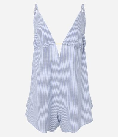 Ref: Macaquinho feminino confeccionado em viscose mais sustentável através de boas práticas ambientais. Possui decote em v na frente e costas, design frontal transpassado criando um efeito levemente drapeado no busto, alças finas e ajustáveis, acinturada por um elástico interno, nas laterais das costas apresenta cordões, short de modelagem solta e fluida e estampa listrada.