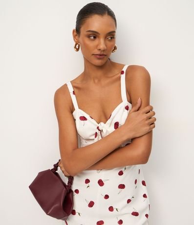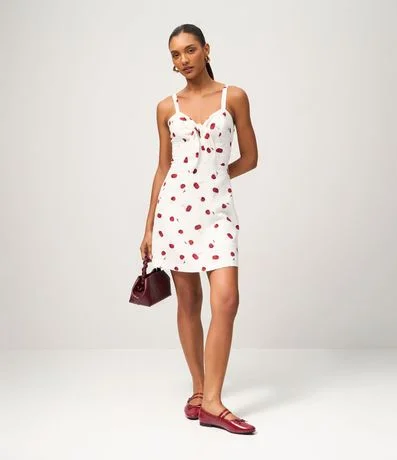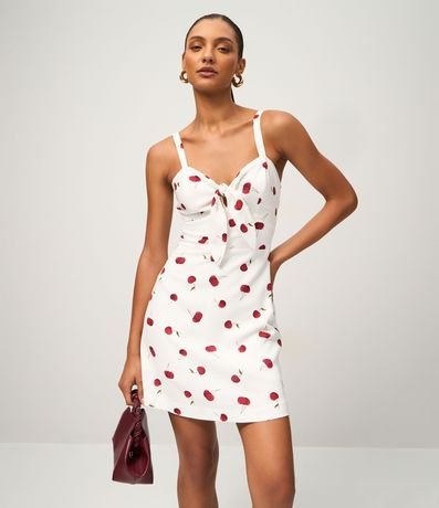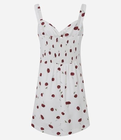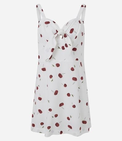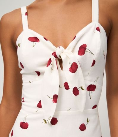 Ref: Macaquinho feminino confeccionado em viscose certificada, através de boas práticas ambientais. Possui alças finas fixas, amarração no decote e estampa de cerejas por toda a peça.