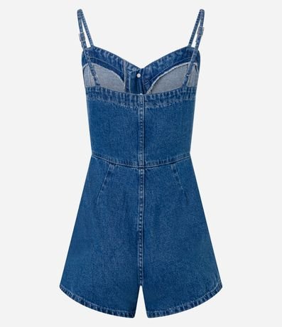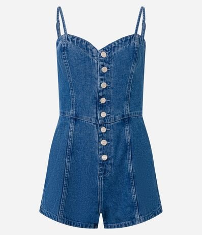 Ref: Macaquinho feminino confeccionado em jeans mais sustentável, no modelo curto. Possui decote coração, alças finas, fechamento por botões e recortes frontais.