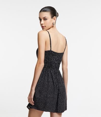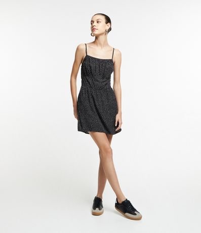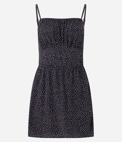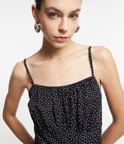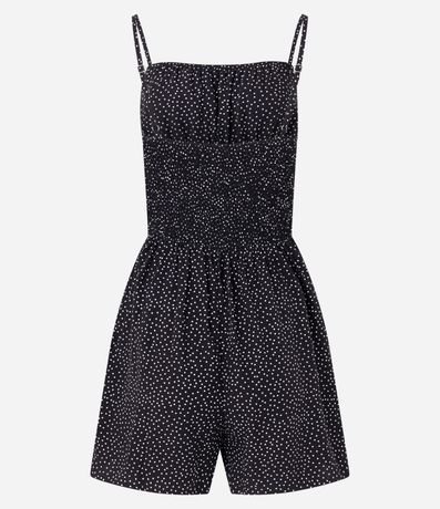 Ref: Macacão curto sem mangas confeccionado em viscose com alcinhas finas reguláveis. Conta com short saia e estamparia de poás - bolinhas.