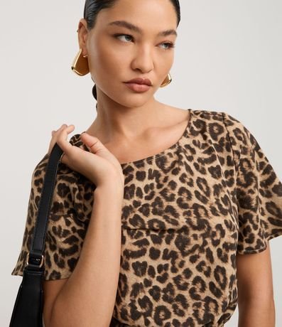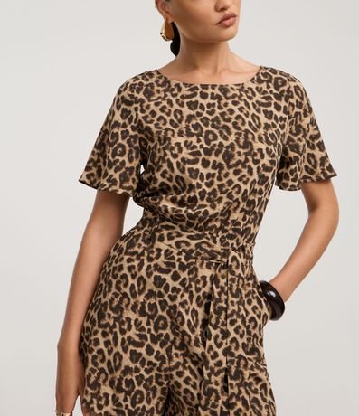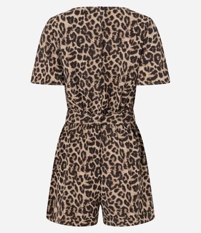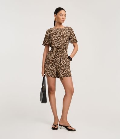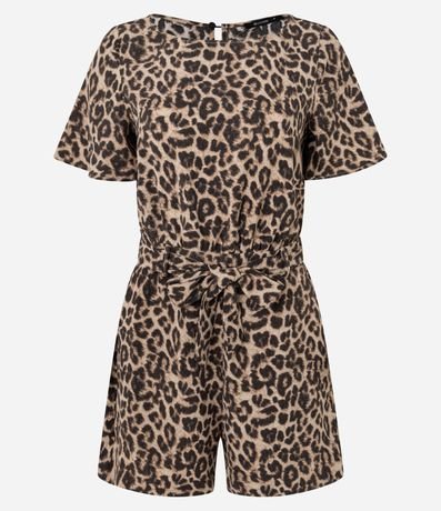 Ref: Macaquinho de mangas curtas, confeccionado em airflow, com gola redonda com fechamento por gota, cinto de tecido para amarração e elástico na cintura e estampa de animal print de onça.