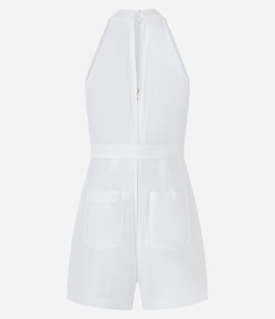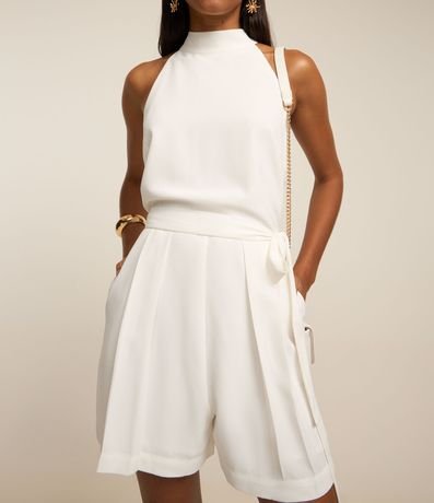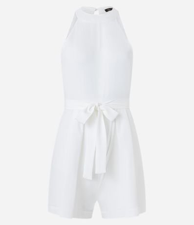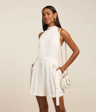Ref: Macaquinho feminino, confeccionado em crepe, com gola rente ao pescoço, fechamento costas, bolsos e amarração na cintura.