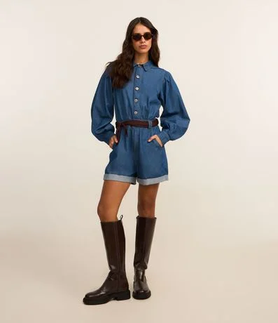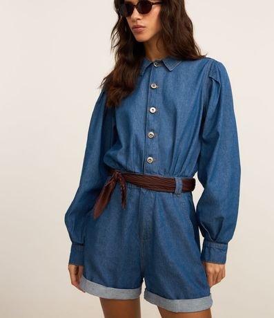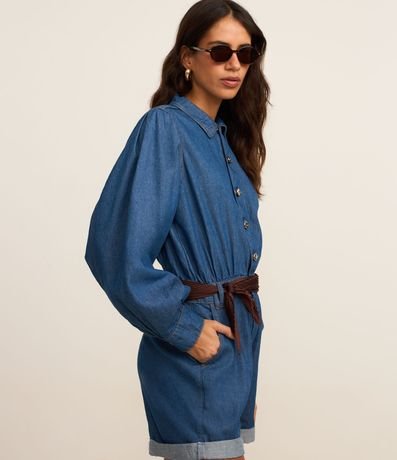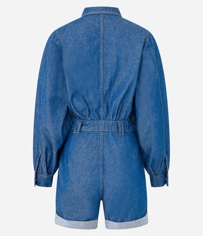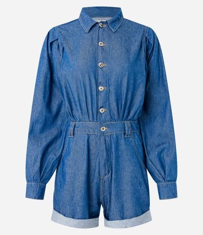 Ref: Macaquinho feminino confeccionado em jeans de algodão certificado bci, peça com gola polo, abotoamento frontal, manga longa bufante ajustada, bolsos, e barra dobrada.