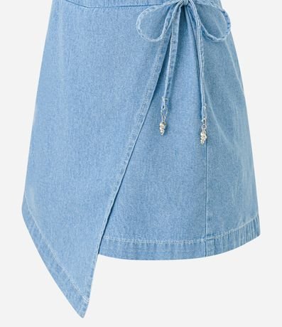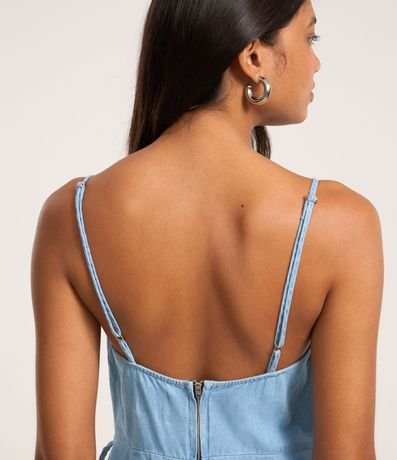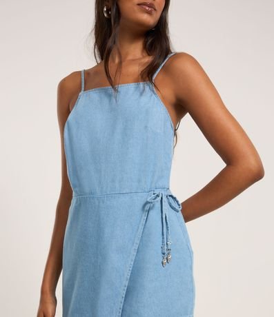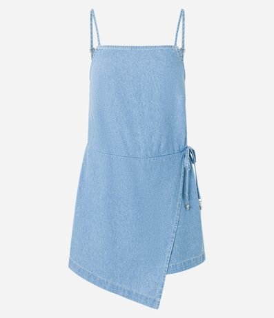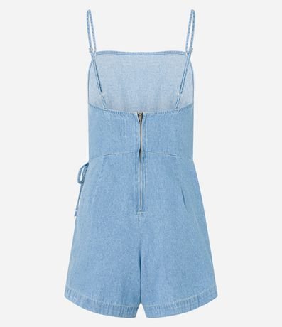 Macaquinho curto confeccionado em jeans com algodão bci mais sustentável, alcinhas finas e amarração na lateral.