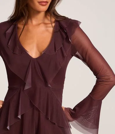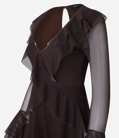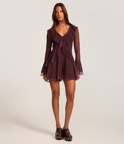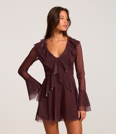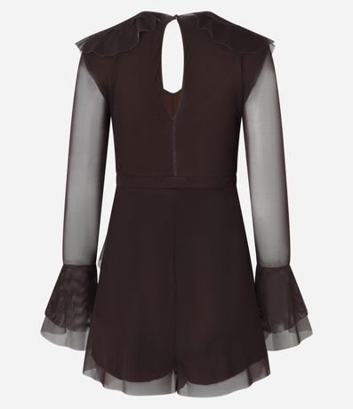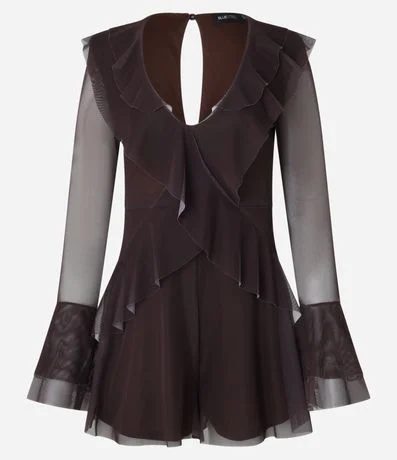 Ref: Macaquinho curto confeccionado em tule com decote v, manga longa transparente, produzido em boas práticas ambientais e com babados.