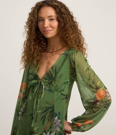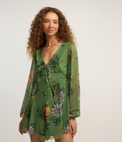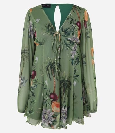 Ref: Macaquinho curto com manga longa bufante, confeccionado em tule com boas práticas ambientais, recorte gota nas costas e estampa floral.
