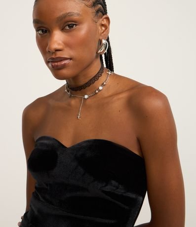 Macaquinho curto com decote tomara que caia, coração, fechamento por zíper invisível e confeccionado em veludo.